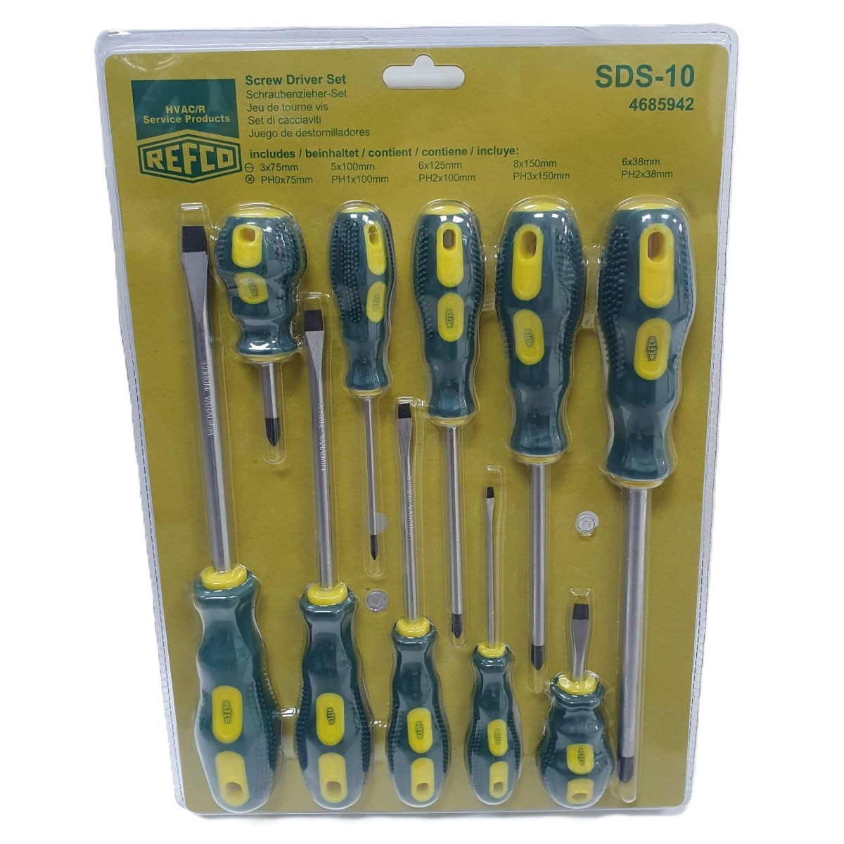 Sada šroubováků REFCO s ergonomicky tvarovanou rukojetí, protiskluzová ochrana pro optimální přenos síly, vysoce kvalitní chrom-vanadová ocel. 10 ks, Refco ploché: 3x75mm, 5x100mm, 6x125mm, 8x150mm, 6x38mm křížové: PH0x75mm, PH1x100mm, PH2x100mm PH3x150mm,PH2x38mm